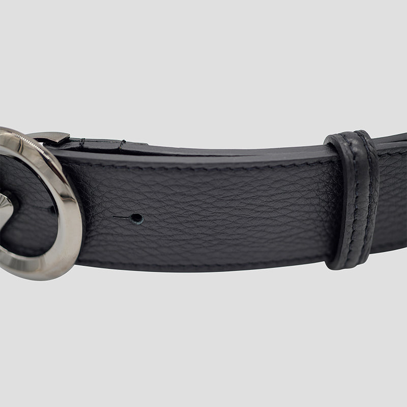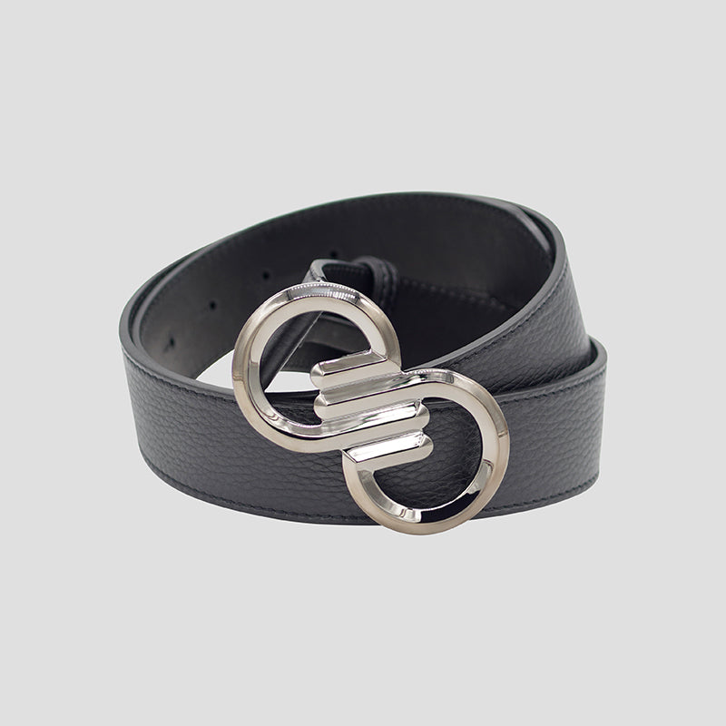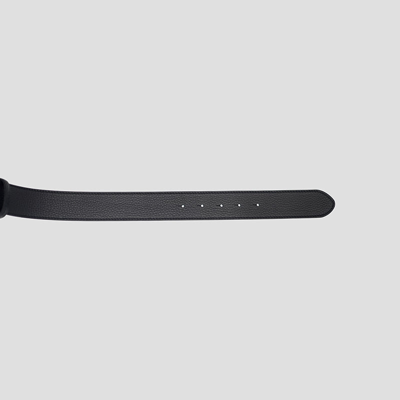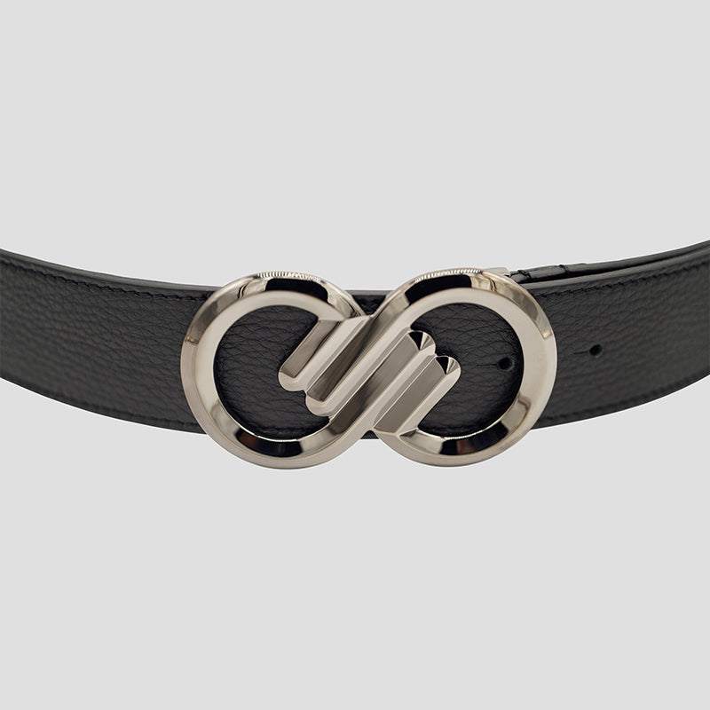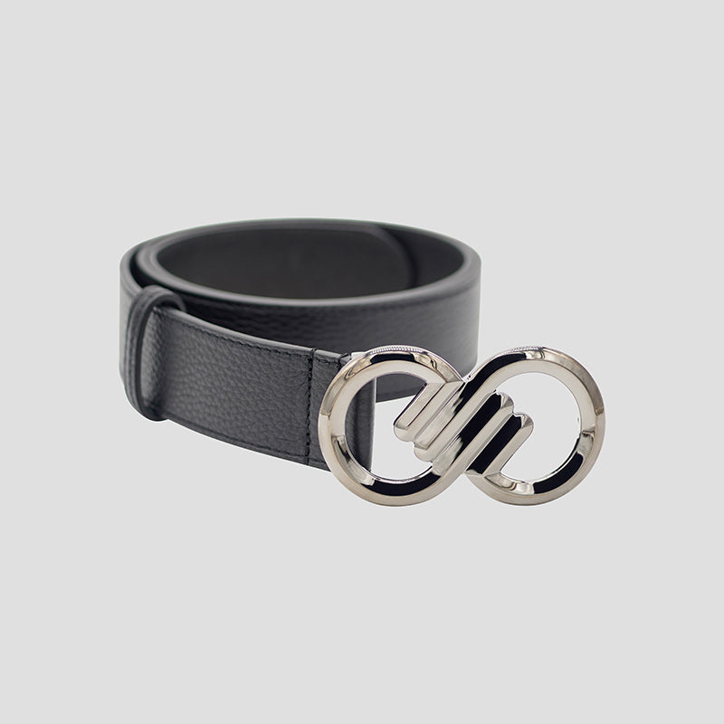Beautifully hand-crafted luxury pebbled calfskin belt designed to perfectly fit your style and lifestyle. Adorned with solid brass Infinitude buckle in gunmetal finish for an exquisite and timeless look. Wear this black leather belt however way you like, it’s a statement piece.