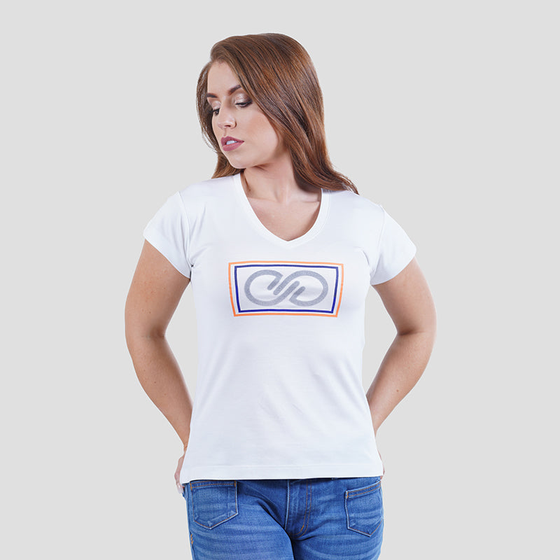 Experience ultimate comfort and style with our "Boxed Infinitude" V-neck Tee for women. With a unique flock print design, this t-shirt is carefully crafted for the perfect fit and uses the softest and most comfortable cotton for a luxurious feel.